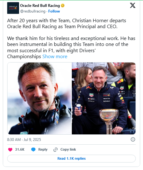 "Após 20 anos na equipe, Christian Horner deixa a RBR como diretor e CEO da equipe. Agradecemos a ele por seu trabalho incansável e excepcional. Ele foi fundamental para transformar esta equipe em uma das mais bem-sucedidas da F1, com oito títulos de pilotos e seis de construtores. Obrigado por tudo, Christian, você sempre será uma parte importante da história da nossa equipe", escreveu o time, na publicação.