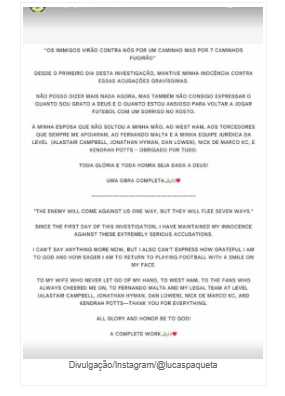 A Federação Inglesa (FA) anunciou que Lucas Paquetá foi inocentado das acusações de má conduta em relação a supostas tentativas de manipulação de jogos do Campeonato Inglês que poderia favorecer o mercado de apostas. O brasileiro foi denunciado em maio de 2024, e a audiência foi iniciada em março e finalizada em junho.
