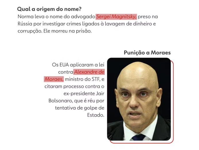 Seu uso contra o ministro Alexandre de Moraes foi imposto no dia 30 de julho por um ato administrativo do Departamento do Tesouro dos EUA com base numa ordem executiva de 2017 de Trump.