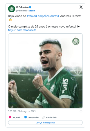 O Palmeiras quer utilizá-lo nos duelos das quartas de final da Libertadores contra o River Plate, em 17 e 24 de setembro. Ele foi contratado para substituir Richard Rios, negociado com o Benfica por 30 milhões de euros – R$ 195 milhões à época. Andreas é o 12º reforço do Palmeiras em 2025. A contratação do meio-campista faz o clube ultrapassar R$ 700 milhões com reforços na temporada e superar o Botafogo para se tornar o time que mais investiu em reforços em um único ano na história do futebol brasileiro.
