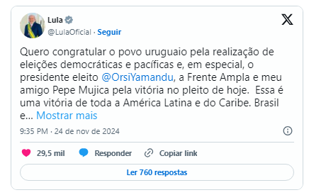 Direita reconheceu a derrota antes do fim das contagens dos votos; presidente Luis Lacalle Pou parabenizou Orsi pelo resultado e se colocou à disposição para transição de governo