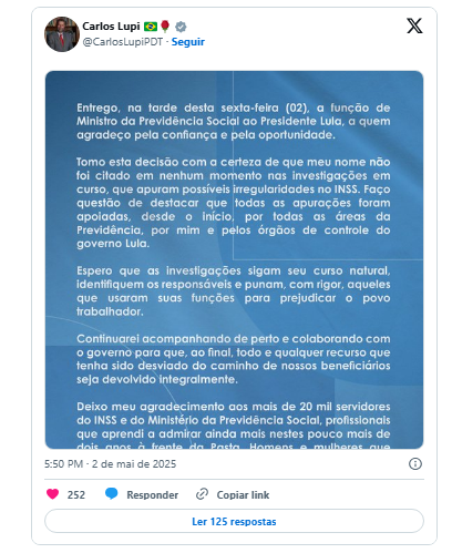 “Entrego, na tarde desta sexta-feira (2), a função de ministro da Previdência Social ao presidente Lula, a quem agradeço pela confiança e pela oportunidade. Tomo esta decisão com a certeza de que meu nome não foi citado em nenhum momento nas investigações em curso, que apuram possíveis irregularidades no INSS. Faço questão de destacar que todas as apurações foram apoiadas, desde o início, por todas as áreas da Previdência, por mim e pelos órgãos de controle do governo Lula. Espero que as investigações sigam seu curso natural, identifiquem os responsáveis e punam, com rigor, aqueles que usaram suas funções para prejudicar o povo trabalhador”, disse Lupi, em nota (veja a íntegra abaixo).