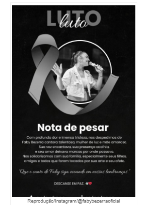 A cantora de forró Faby Bezerra faleceu na quinta-feira (19), em Fortaleza, aos 37 anos. A artista lutava contra um câncer de colo de útero e deixa para trás um marido e quatro filhos. A confirmação da triste notícia foi feita através de um comunicado no perfil oficial da cantora. Com grande tristeza, nos despedimos de Faby Bezerra, uma mulher iluminada, talentosa e uma mãe dedicada. Sua voz cativante e sua presença acolhedora deixaram uma marca indelével em todos que tiveram o privilégio de conhecê-la. Faby fez parte de várias bandas de forró ao longo de sua carreira, sendo seu último projeto com o grupo Forró Bota Pra Cima. Ela residia em Limoeiro do Norte, no Ceará, e seu corpo foi velado na manhã de hoje.