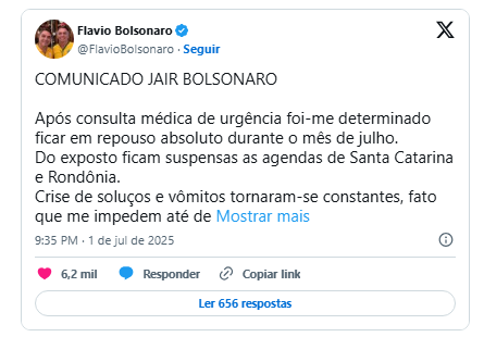 O ex-presidente Jair Bolsonaro passou mal novamente nesta terça-feira (1) e precisou cancelar todos os compromissos de julo após passar mal novamente e precisar de atendimento de urgência. Por meio de nota, compartilhada nas redes sociais do senador Flávio Bolsonaro, “após consulta médica de urgência, foi determinado repouso absoluto durante o mês de julho”, diz o comunicado. “Crises de soluço e vômito tornaram-se constantes, fato que me impede até de falar”, diz a nota, acrescentando que seguindo as orientações médicas, “ficam suspensas as agendas de Santa Catarina e Rondônia”. No final de junho, Bolsonaro tinha recebi um possível diagnóstico de pneumonia viral e desde a data, tem sofrido com soluços e vômitos.