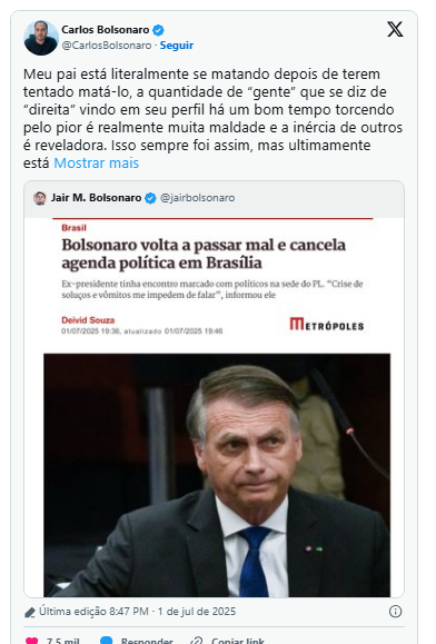O vereador Carlos Bolsonaro (PL-RJ), outro filho do ex-presidente, compartilhou a publicação e disse que seu pai “está literalmente se matando depois de terem tentado matá-lo”. Ele ainda ressaltou que Bolsonaro passou por “uma cirurgia de mais de 10 horas em menos de cerca de 2 meses”. O vereador já tinha informado anteriormente que os sintomas e mal-estar do ex-presidente são consequências diretas da facada de 2018. Em ocasiões anteriores, o próprio ex-presidente disse: “Eu vomito 10 vezes por dia”, se referindo as sequelas do atentado. Desde o ataque, Bolsonaro já passou por seis cirurgias, a últimas delas foi em abril de 2025, quando tratou obstrução intestinal.
