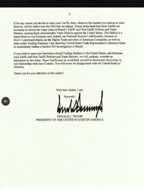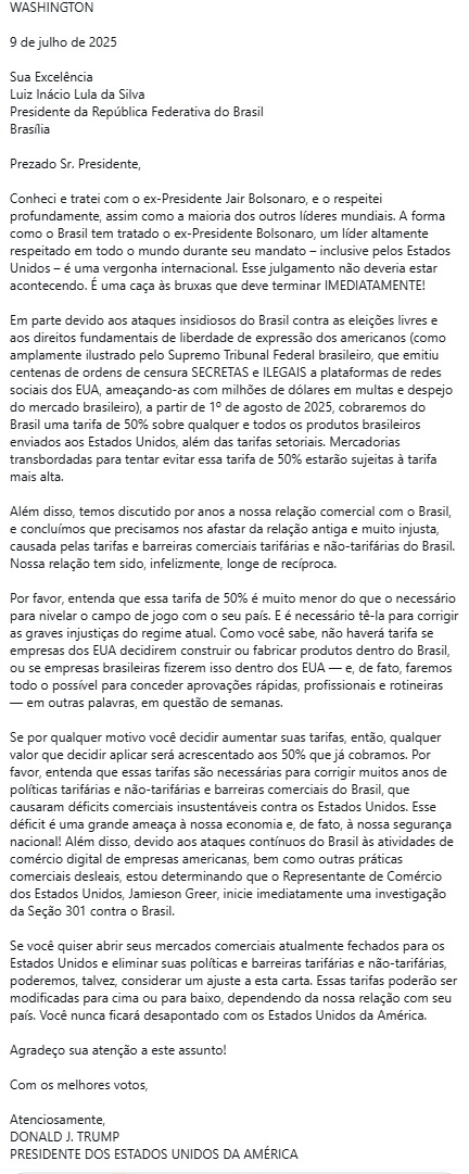 “Devido aos ataques insidiosos do Brasil contra eleições livres e os direitos fundamentais à liberdade de expressão dos americanos (…), cobraremos uma tarifa de 50% sobre qualquer produto brasileiro enviado aos Estados Unidos”, diz o texto. Trump também alertou que produtos redirecionados por outros países para driblar a tarifa também estarão sujeitos à sobretaxa.