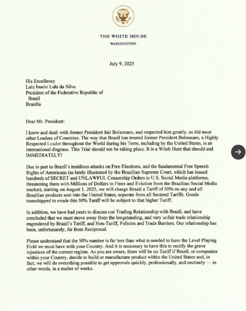 A carta intensifica a tensão diplomática entre os dois países em um momento de crescente instabilidade geopolítica e de polarização eleitoral nos Estados Unidos. Até o momento, o governo brasileiro não se pronunciou oficialmente sobre o conteúdo da mensagem nem sobre as possíveis consequências da nova medida tarifária.