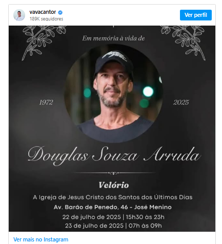 Vavá também destacou a importância da memória de Douglas, afirmando que sua história permanecerá viva: “Meu irmão, uma pessoa cheia de alegria, sempre com um sorriso no rosto e um coração generoso, agora está no céu. Seu legado nunca será esquecido. Meus sentimentos a todos os familiares e amigos”, completou.