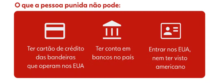Instituições financeiras do mundo todo podem ser obrigadas a congelar ativos, fechar contas e cancelar cartões de crédito da pessoa sancionada;Além disso, a pessoa pode ser impedida de ir para os Estados Unidos ou ter seu visto cancelado;
