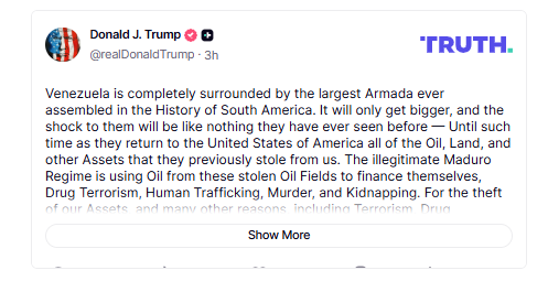 “Portanto, hoje, estou ordenando um BLOQUEIO TOTAL E COMPLETO de todos os petroleiros sancionados que entram e saem da Venezuela”, acrescentou, informando que o país está cercado, e acusando os venezuelanos de roubarem petróleo e terras dos norte-americanos.