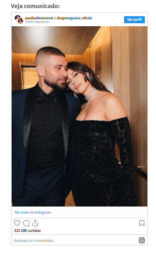 Juntos desde julho de 2021, Paolla e Diogo somavam quase cinco anos de união. No texto divulgado, ambos afirmaram que o término não foi motivado por desentendimentos graves, mas sim por uma transformação natural da relação.