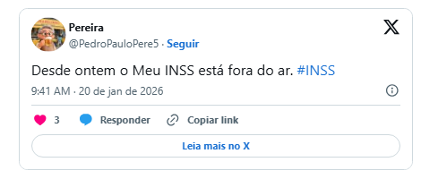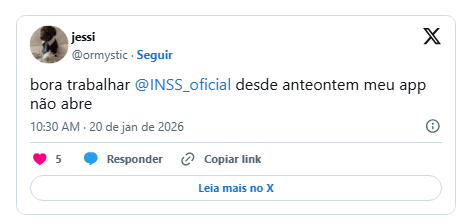 A Jovem Pan testou o site na plataforma DownDetector e registrou que desde segunda-feira (19) o site “Meu INSS” apresenta instabilidade. Na última atualização, às 11h52 desta terça-feira (20), havia 34 reclamações. O pico das reclamações foi registrado às 10h52, com 80 notificações de erro.Perfis no X (antigo Twitter) colocaram suas reclamações do aplicativo. Um deles postou que “desde anteontem meu app não abre”. Outro disse que o “meu INSS tá fora do ar maior ‘tempão'”.