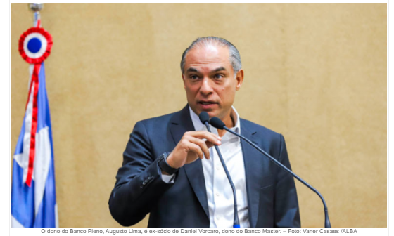 O dono do Banco Pleno, Augusto Lima, é ex-sócio de Daniel Vorcaro, dono do Banco Master. Lima chegou a ser preso em novembro, na primeira fase da operação Compliance Zero. Ele mantinha sociedade no Master e era considerado próximo de Vorcaro.