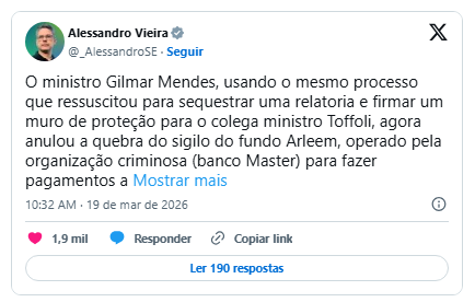 O senador Alessandro Vieira (MDB-SE) reagiu com críticas à decisão de Gilmar Mendes. Em publicação nas redes sociais, o parlamentar afirmou que o objetivo da medida é “travar investigações e garantir a impunidade de poderosos”. Veja a manifestação abaixo: