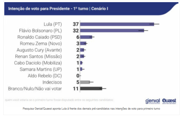 Em relação ao cenário de primeiro turno, Lula aparece na frente com 37% das intenções de voto. Flávio Bolsonaro aparece em segundo com 32%, seguido por Caiado com 6% e Zema com 3%.