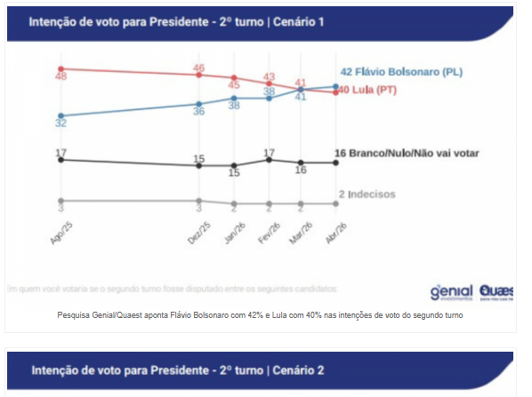 O pré-candidato Flávio Bolsonaro (PL) superou numericamente o presidente Lula (PT), pela primeira vez, nas intenções de voto para o segundo turno, segundo pesquisa Genial/Quaest divulgada nesta quarta-feira (15). O filho do ex-presidente Jair Bolsonaro e o petista empatam tecnicamente, com 42% contra 40%, respectivamente.