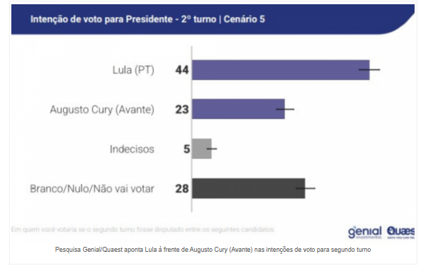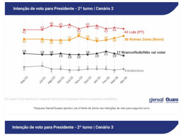 Com exceção de Flávio, o atual presidente aparece numericamente à frente em todos os outros cenários. Contra Romeu Zema (Novo), Lula tem 43% das intenções, enquanto o ex-governador de Minas Gerais aparece com 36%. Contra Ronaldo Caiado (PSD), Lula mantém os 43%, enquanto o ex-chefe do Executivo de Goiás aparece com 35%.