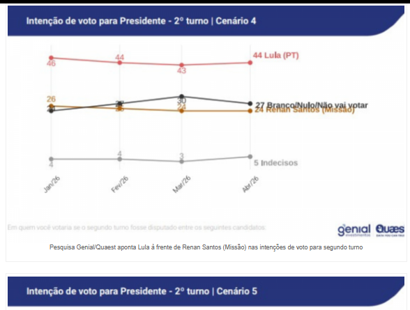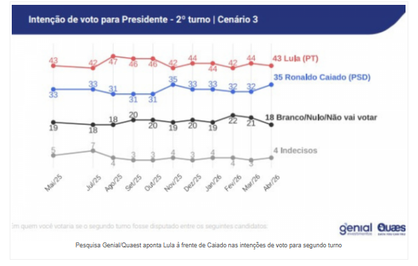 Realizada entre os dias 9 e 13 de abril, a pesquisa está registrada no Tribunal Superior Eleitoral sob o número BR-09285/2026. Foram feitas 2.004 entrevistas, com brasileiros de 16 anos ou mais. A margem de erro estimada é de 2 pontos percentuais.