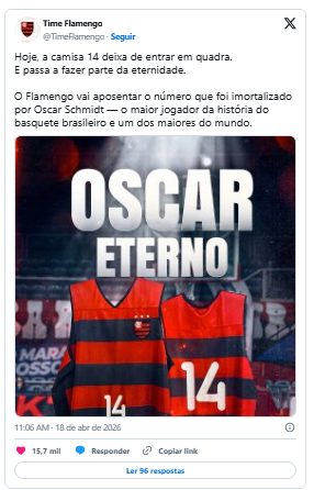 O Flamengo anunciou neste sábado (18) que aposentou a camisa 14 do basquete em homenagem ao Oscar Schmidt, que morreu na sexta-feira (17).“Hoje, a camisa 14 deixa de entrar em quadra. E passa a fazer parte a eternidade. O Flamengo vai aposentar o número que foi imortalizado por Oscar Schmidt – o maior jogador da história do basquete brasileio e um dos maiores do mundo”, escreveu o clube carioca em sua conta o X (antigo Twitter).