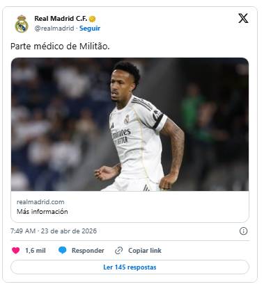 “Após os exames realizados hoje em nosso jogador Éder Militão pelos Serviços Médicos do Real Madrid, foi diagnosticada uma lesão muscular no bíceps femoral da perna esquerda”, informou o Real Madrid em um comunicado.