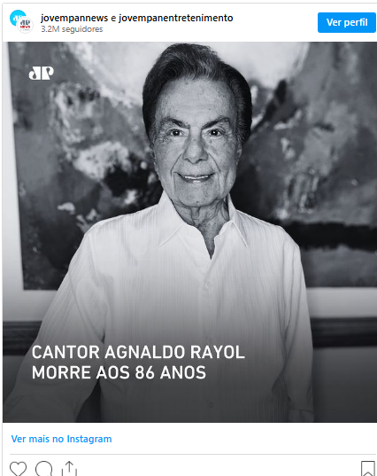 Cantor Agnaldo Rayol morre aos 86 anos Dono de sucessos como ‘Mia Gioconda’ e ‘Tormento D’Amore’, artista ficou conhecido por sua voz potente de barítono e por participar de diversos filmes entre as décadas de 1950 e 1970