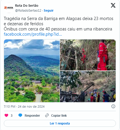 O acidente ocorreu próximo à cidade de União dos Palmares, “tirou vidas e deixou muitas pessoas feridas”, disse mais cedo na rede X o governador, Paulo Dantas. “Recebi com profunda tristeza a notícia da tragédia em União dos Palmares, que tirou vidas e deixou muitas pessoas feridas. Reafirmo meu acolhimento às famílias e amigos das vítimas neste momento tão difícil”, escreveu o governador em sua conta no Twitter. “Determinei a mobilização total do Estado e equipes do Corpo de Bombeiros, SAMU e a estrutura de saúde estão atuando para socorrer e atender os feridos. As vítimas estão sendo acolhidas nas UPAs e no Hospital Regional da Mata”, acrescentou. O ônibus saiu da estrada em uma região montanhosa chamada Serra da Barriga, de difícil acesso. Dantes declarou três dias de luto no estado pela “tragédia”.