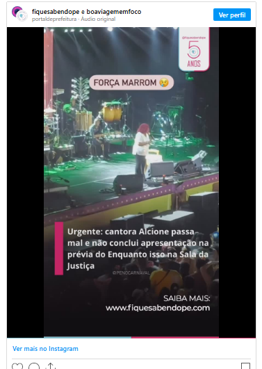 A cantora Alcione passou mal e precisou interromper um show, na noite desta sexta-feira (14), no Centro de Convenções, em Olinda, no Recife. “Pessoal, vou precisar parar o show um pouco. Não me senti bem no camarim. Alguém me abana aqui, por favor”, pediu a cantora. Alcione recebeu apoio da equipe e pediu licença ao público para trocar de roupa no camarim. “Pessoal, fui botar outra roupa, uma mais fresca”, explicou, sendo acolhida por aplausos.