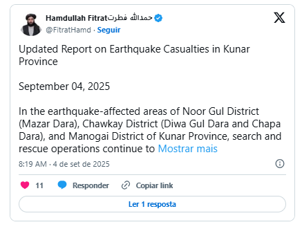 Hamdullah Fitrat, porta-voz adjunto do governo, declarou no X que entre os 2.217 mortos e quase 4.000 feridos, a maioria das vítimas concentra-se na província de Kunar, perto da fronteira com o Paquistão, e informou que as operações de resgate continuam. Quatro dias após o terremoto, os moradores das aldeias nas montanhas de Kunar ainda aguardam a chegada de ajuda, dificultada pelos desmoronamentos e deslizamentos de terra. “Precisamos urgentemente de tendas, água, comida e medicamentos”, disse à AFP Zahir Jan Safi, um agricultor de 48 anos, da aldeia de Mazar Dara, que ficou devastada.