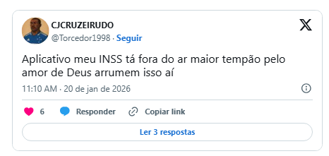 A Jovem Pan testou o site na plataforma DownDetector e registrou que desde segunda-feira (19) o site “Meu INSS” apresenta instabilidade. Na última atualização, às 11h52 desta terça-feira (20), havia 34 reclamações. O pico das reclamações foi registrado às 10h52, com 80 notificações de erro.Perfis no X (antigo Twitter) colocaram suas reclamações do aplicativo. Um deles postou que “desde anteontem meu app não abre”. Outro disse que o “meu INSS tá fora do ar maior ‘tempão'”.