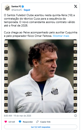 O Santos anunciou, nesta quinta-feira (19), a contratação do técnico Cuca. Com contrato até o final de 2026, o treinador chega ao clube alvinegro com o auxiliar e seu filho, Cuquinha, e com o preparador físico Omar Feitosa. Ele chega para substituir o argentino Juan Pablo Vojvoda, demitido nesta madrugada após derrota para o Internacional por 2 a 1, na Vila Belmiro.