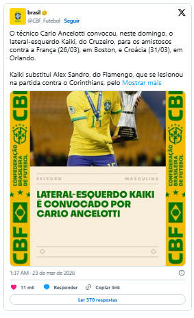 “O técnico Carlo Ancelotti convocou, nesta segunda-feira (23), o lateral-esquerdo Kaiki, do Cruzeiro, para os amistosos contra França (26/03), em Boston, e Croácia (31/03), em Orlando. Kaio substitui Alex Sandro, do Flamengo, que se lesionou contra o Corinthians, pelo Campeonato Brasileiro”, anunciou a CBF.